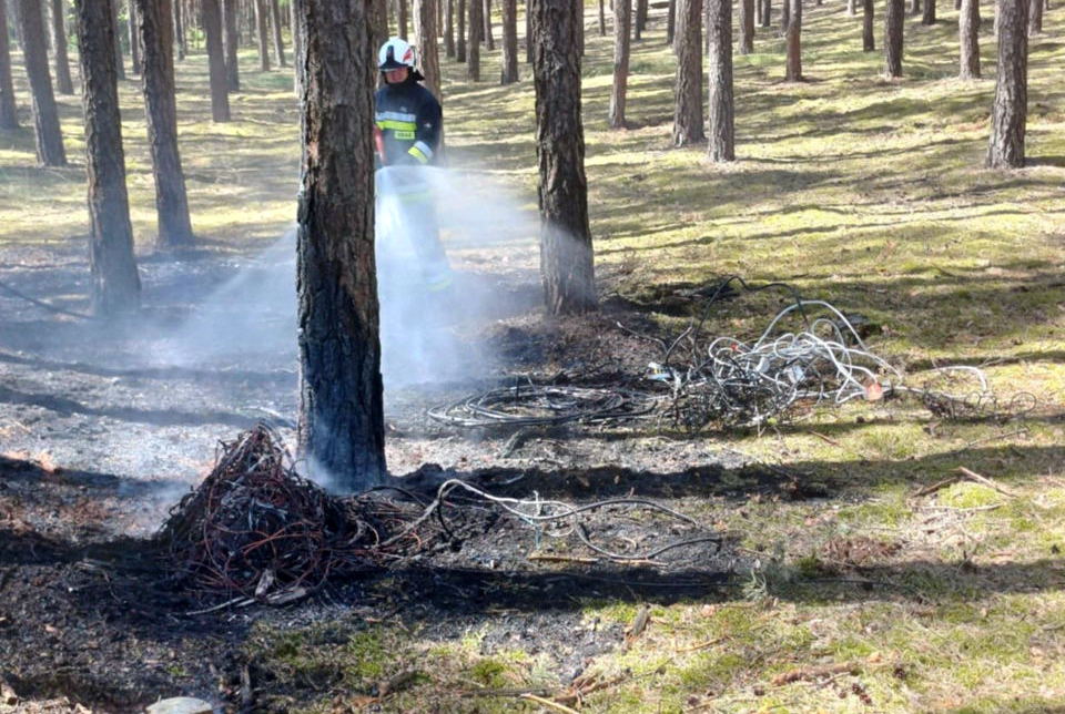 To, co strażacy i leśnicy zastali na miejscu pożaru, wprawiło ich w niemałe zdziwienie. Okazało się, że nieznany sprawca postanowił w lesie wypalać przewody elektryczne…