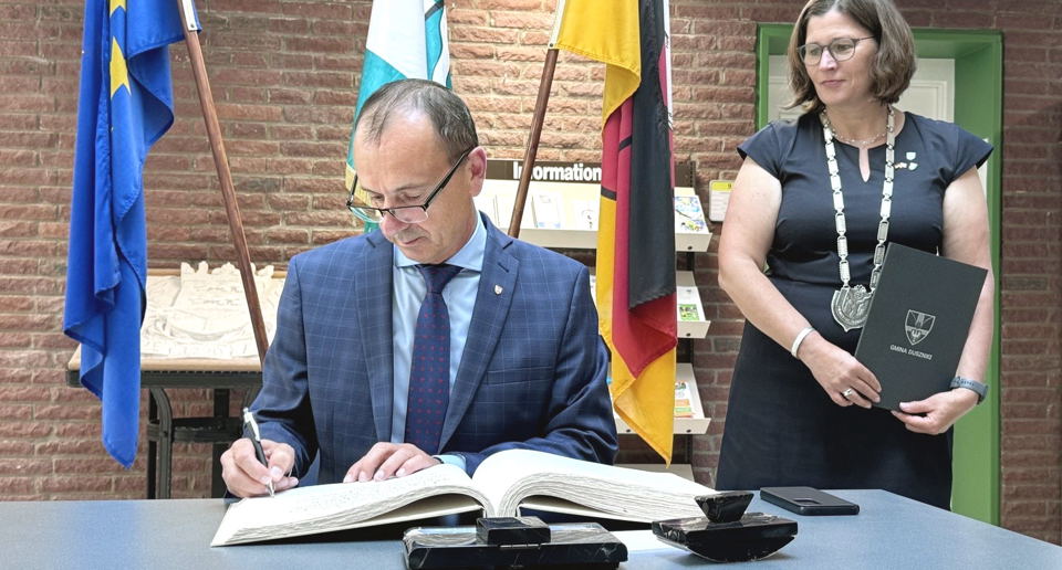 Wizyta samorządowców z Dusznik rozpoczęła się od spotkania z Burmistrz Fassberga Kerstin Speder w ratuszu miejskim. Wójt Radosław Łanoszka, zwracając się do gości spotkania i pani burmistrz, podkreślił znaczenie partnerstwa i współpracy między gminami, a następnie wpisał się do Złotej Księgi Gminy Fassberg.