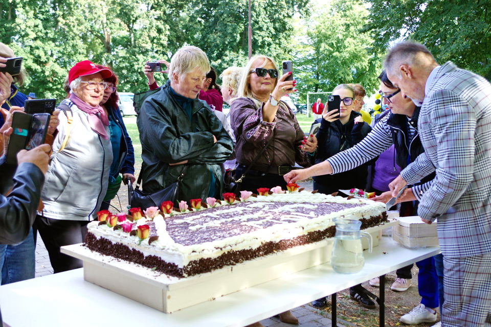 Foto nad tekstem: Burmistrz Rafał Zimny podjął się krojenia i dzielenia tortu. Operacja trwała kilkadziesiąt minut
