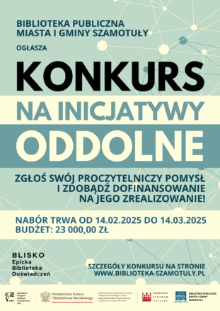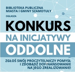 Biblioteka miejska w Szamotułach zaprasza wszystkich mieszkańców gminy Szamotuły, którzy mają pomysł na kreatywne wydarzenie kulturalne propagujące czytelnictwo. Może być to działanie dla wybranej grupy wiekowej, dla dzieci, młodzieży, dorosłych czy seniorów lub dla wszystkich. Wniosek zawierający pomysł na inicjatywę lokalną mogą składać grupy nieformalne, formalne (kluby, fundacje, stowarzyszenia) oraz osoby indywidualne.