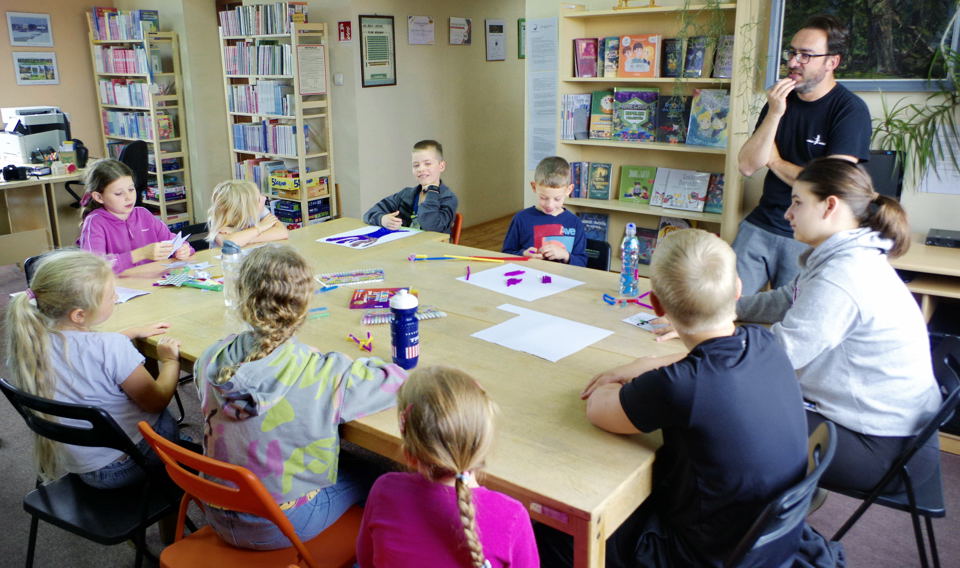 W lipcu Miejska Biblioteka Publiczna w Obrzycku zaprosiła dzieci na warsztaty teatralne prowadzone przez Marlenę Konieczną i Mikołaja Wołochowicza z poznańskiego teatru „Co dwie sztuki”.