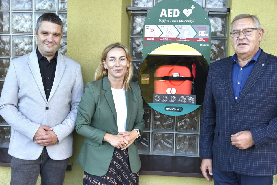 FOTO: Defibrylator AED już na służbie, w pełnej gotowości. O bezpieczeństwo mieszkańców zadbali (od lewej): Marek Kasprzyk, Agnieszka Patysiak i Paweł Siódmiak