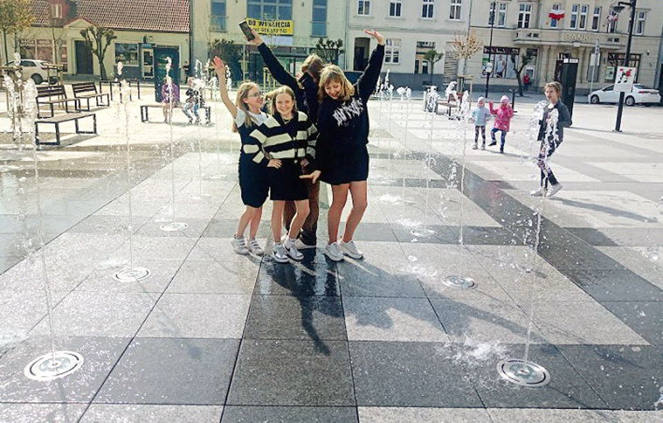 FOTO: Fontannę wybudowano w tzw. części rekreacyjnej Rynku. Znajdują się tutaj też ławeczki, stojaki do rowerów i trochę zieleni. Jest to tzw. fontanna posadzkowa, bez lustra wody i zbiornika wodnego. Do jej zalet należy łatwe utrzymanie w czystości oraz możliwość schłodzenia się w upalne dni