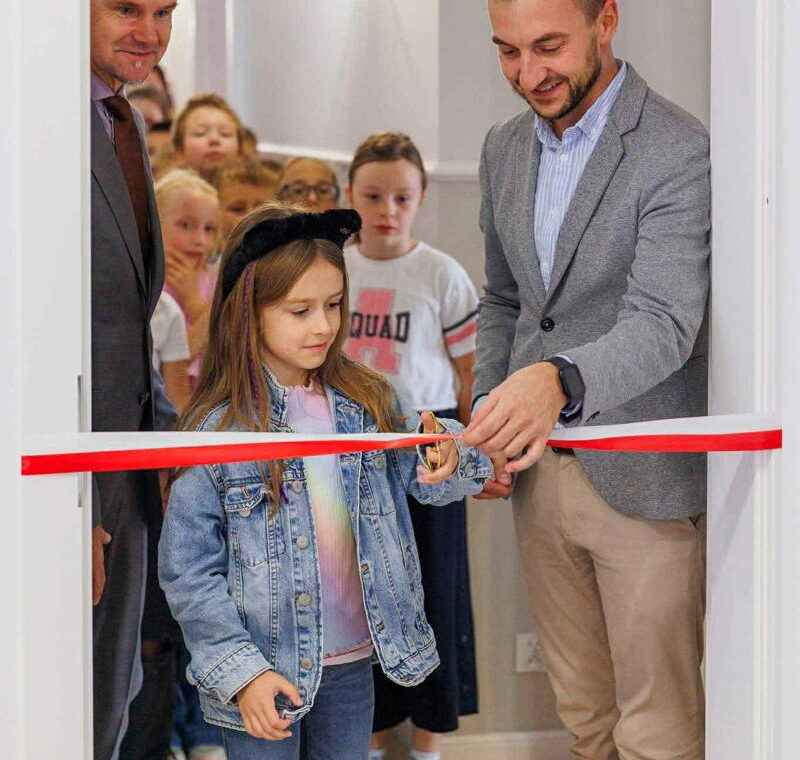 Anastazja, uczennica III klasy szamotulskiej „Jedynki”, burmistrz Piotr Michalak oraz dyrektor biblioteki miejskiej w Szamotułach Piotr Nowak przecięli wstęgę w progu bibliotecznej Pracowni Ekologicznej, tym samym ją otwierając.