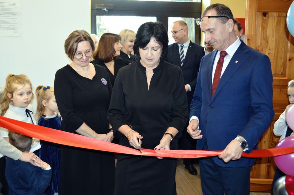 Symboliczne przecięcie wstęgi w wyremontowanym budynku szkolnym w Podrzewiu