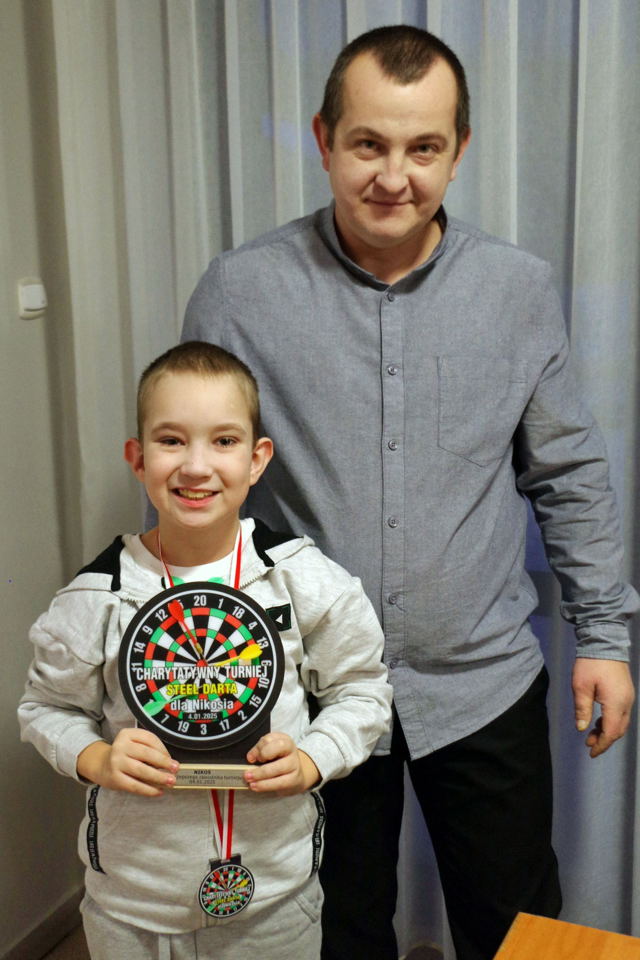 Nikodem Mamet z tatą. Trzyma pamiątkową tarczę z turnieju. Widniała na niej plakietka „Nikoś – dla najlepszego zawodnika turnieju”
