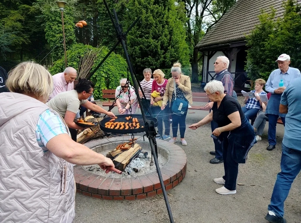 Spacer po okolicy był okazją do integracji i nawiązywania nowych znajomości oraz pozytywnie wpłynął na nasze samopoczucie i apetyty. Chętni mogli skosztować upieczonej na ognisku przez siebie kiełbaski, zaśpiewać ulubione piosenki przy wtórze akordeonu Jana Starosty oraz uczestniczyć w zabawie, konkursach i tańcach.