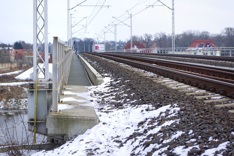 U góry: Widok na przejście techniczne na moście kolejowym od strony Zamościa. Nie trzeba mieć zdolności kaskaderskich, żeby znaleźć się w tym miejscu