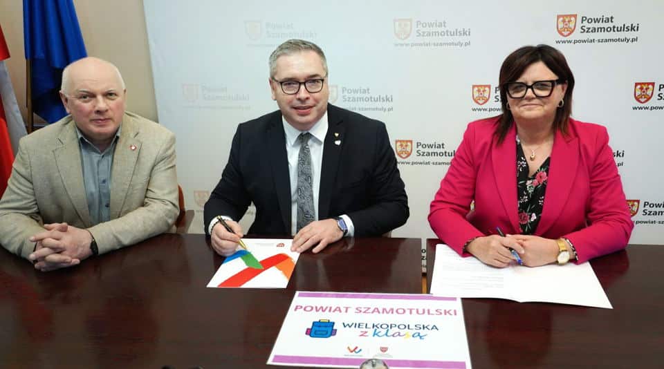 W minioną środę w siedzibie Starostwa Powiatowego w Szamotułach podpisano umowę pomiędzy Województwem Wielkopolskim, reprezentowanym przez członka zarządu Jacka Bogusławskiego, a Powiatem Szamotulskim, reprezentowanym przez starostę Beatę Hanyżak oraz wicestarostę Przemysława Nowaka, dotyczącą programu „Wielkopolska z klasą”. Na jej mocy województwo przekaże naszemu powiatowi dotację na działania edukacyjne i kulturalne.