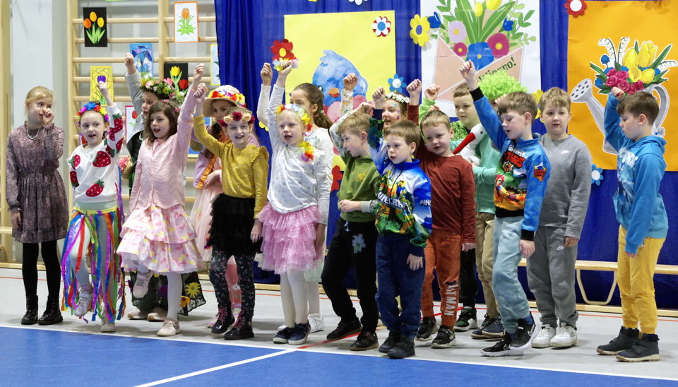 Na zdjęciu – klasa 1A tańczy i śpiewa piosenkę „Maszeruje wiosna”.